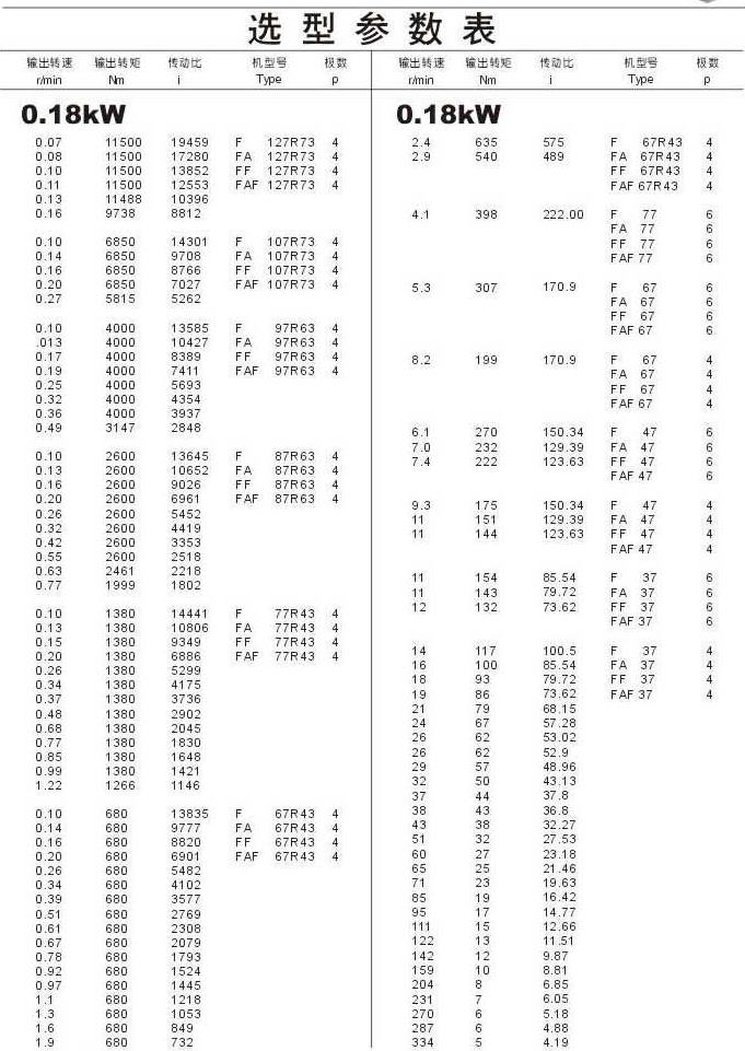 選型參數(shù)表0.18kW