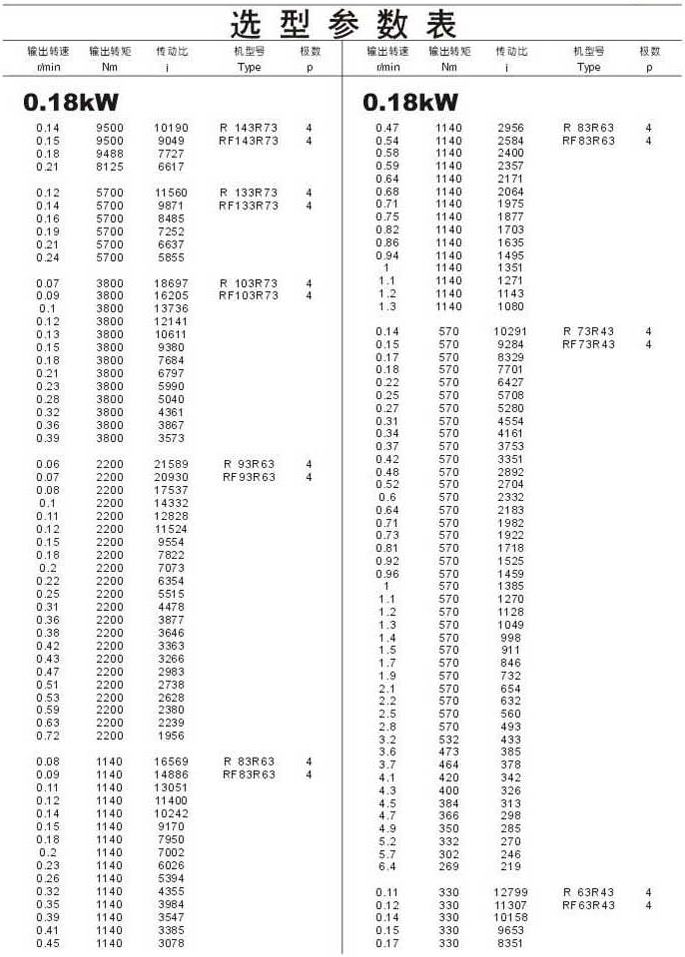 選型參數表0.18kW 46